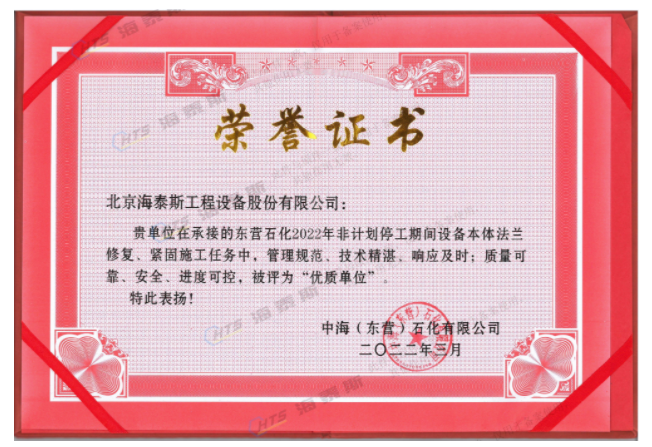 海泰斯獲評“優(yōu)質(zhì)單位”!負責的催化裝置、常減壓裝置泄漏法蘭的在線修復(fù)和定力矩緊固施工任務(wù),實現(xiàn)了“零泄漏”的目標。